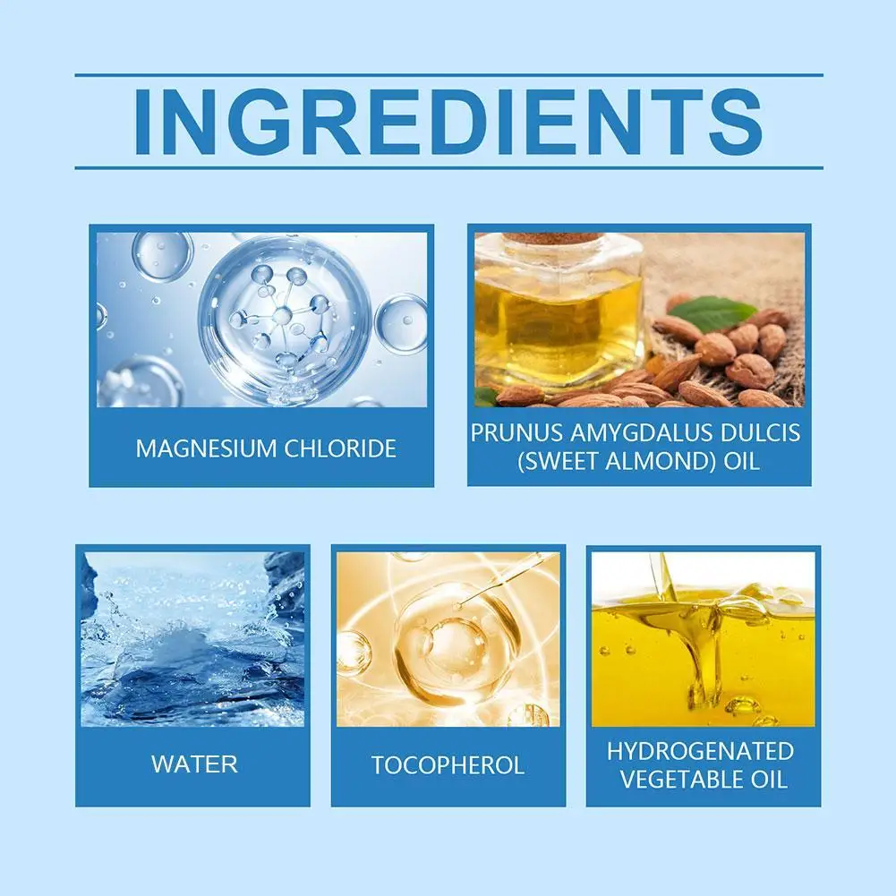 5. Easy to carry: Magnesium Oil is designed with a lightweight and easy-to-carry bottle, which can be taken out and used anytime and anywhere, and can be conveniently used in business trips, travel, offices and other places.