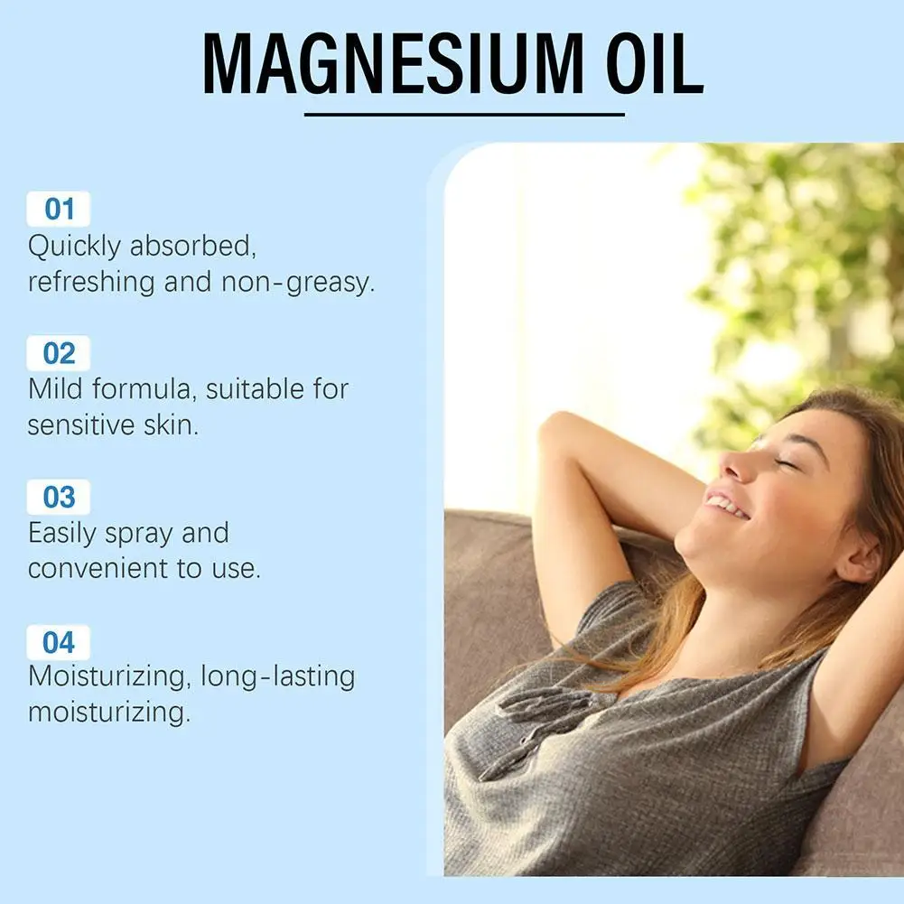 5. Easy to carry: Magnesium Oil is designed with a lightweight and easy-to-carry bottle, which can be taken out and used anytime and anywhere, and can be conveniently used in business trips, travel, offices and other places.