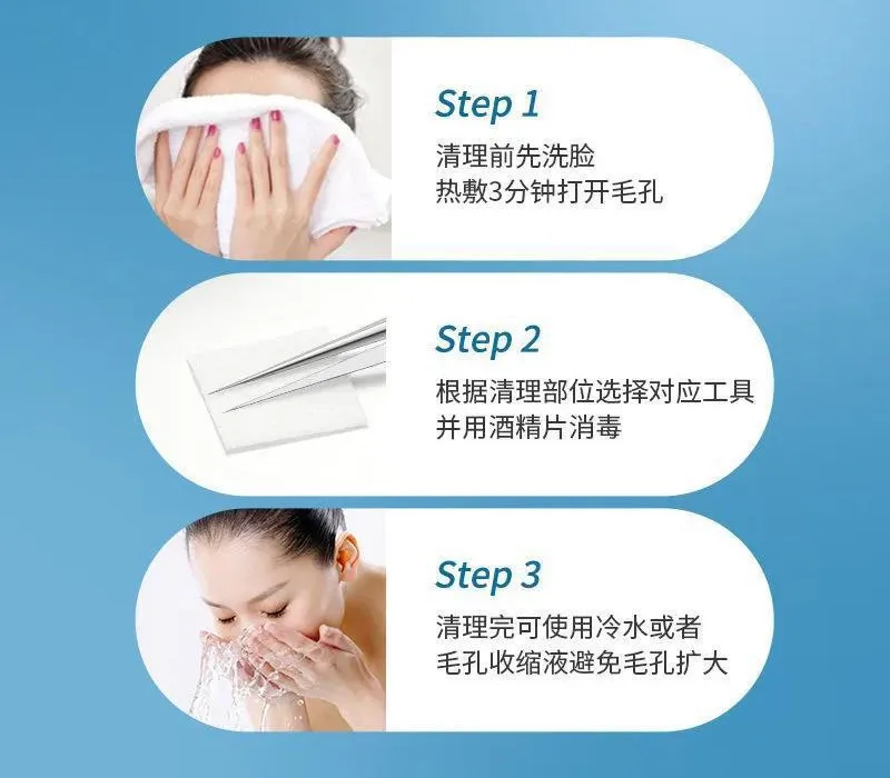Step 1: Please wash your face before cleaning, and then use a towel to hot compress for three minutes to open the pores