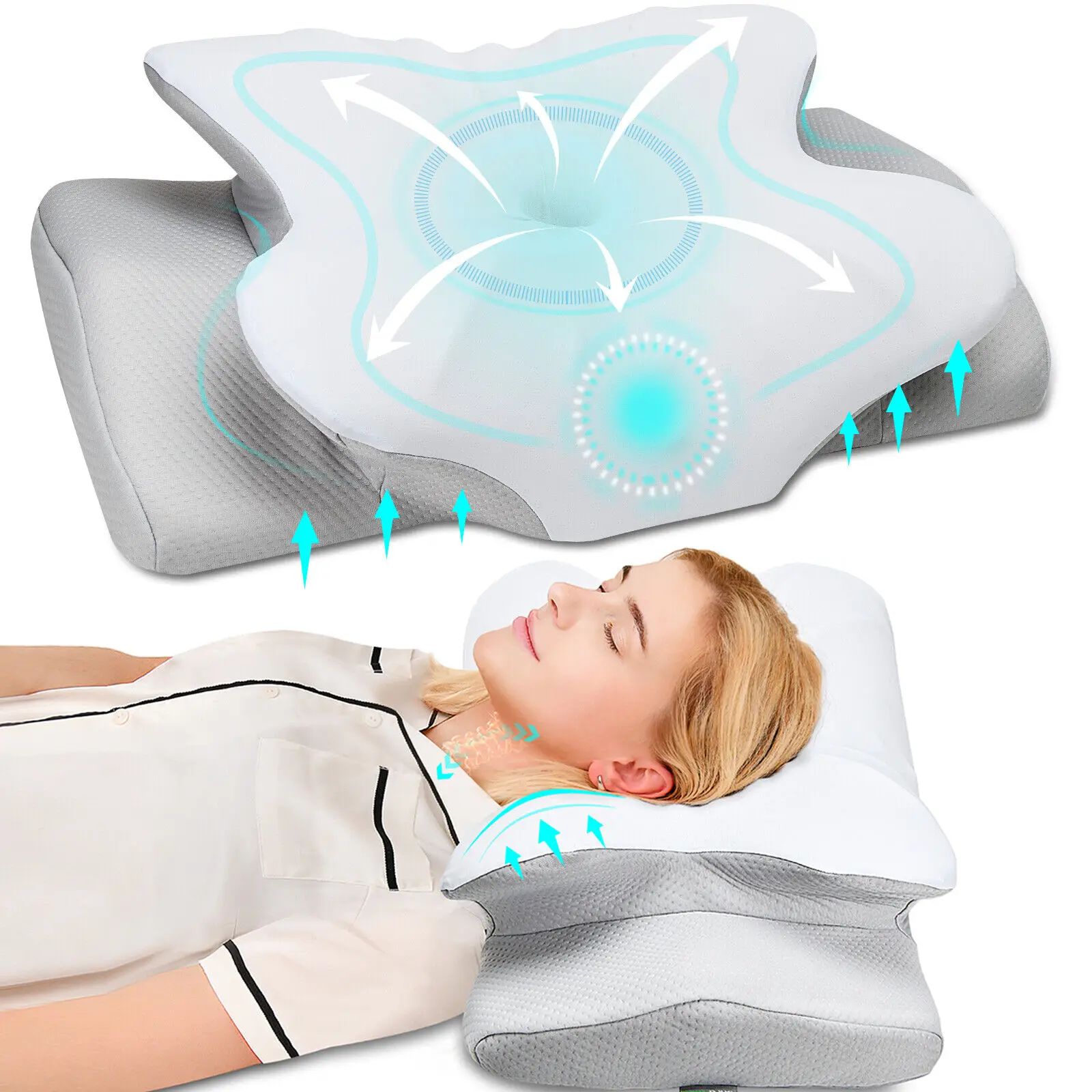 [2 Heights – Designed for Different Sleepers]Our pillow has 2 different contour heights on either side,so you can choose whichever works better for your sleep posture.Butterfly design shape gives armrests,no more arms numbness.It offers enough room for your shoulders and makes good nasal airflow for back,side & stomach sleepers.The hole inside was designed to cradle your head for optimal support & reduce the pressure of the skull.It allows for a comfortable yet supportive night’s sleep.