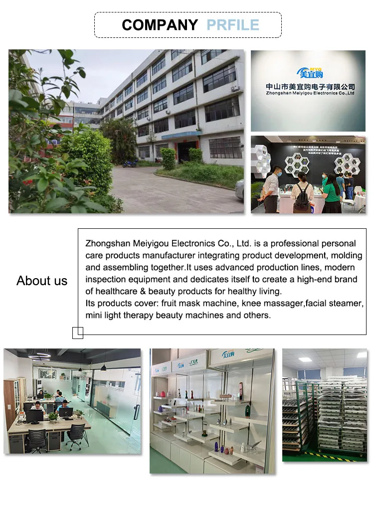 Questions of Company: Q1: Are you manufacturer? A1: Yes, our factory has been for 7 years. Sincerely welcome to visit our factory any time. Q2: What are your main products? A2: Our main products are electronic skincare device, such as the intelligent negative ion beauty devices, RF beauty device, EMS beauty device, ultrasonic beauty equipment, wrinkle removal pen, facial brush, and the fruit mask device; the body care device, such as the knee massager, the hip massagers, body contouring instrument and the foot massagers, the hair remoal device, and the abdomen care device; and the healthy living products, such as the mini washing machine, UV sanitizing wand, Automatic Soap Dispenser, etc..The main technology covers micro-current, positive and negative ions, EMS, ultrasound, high frequency pulse current, IPL, infrared, laser, and radio frequency.